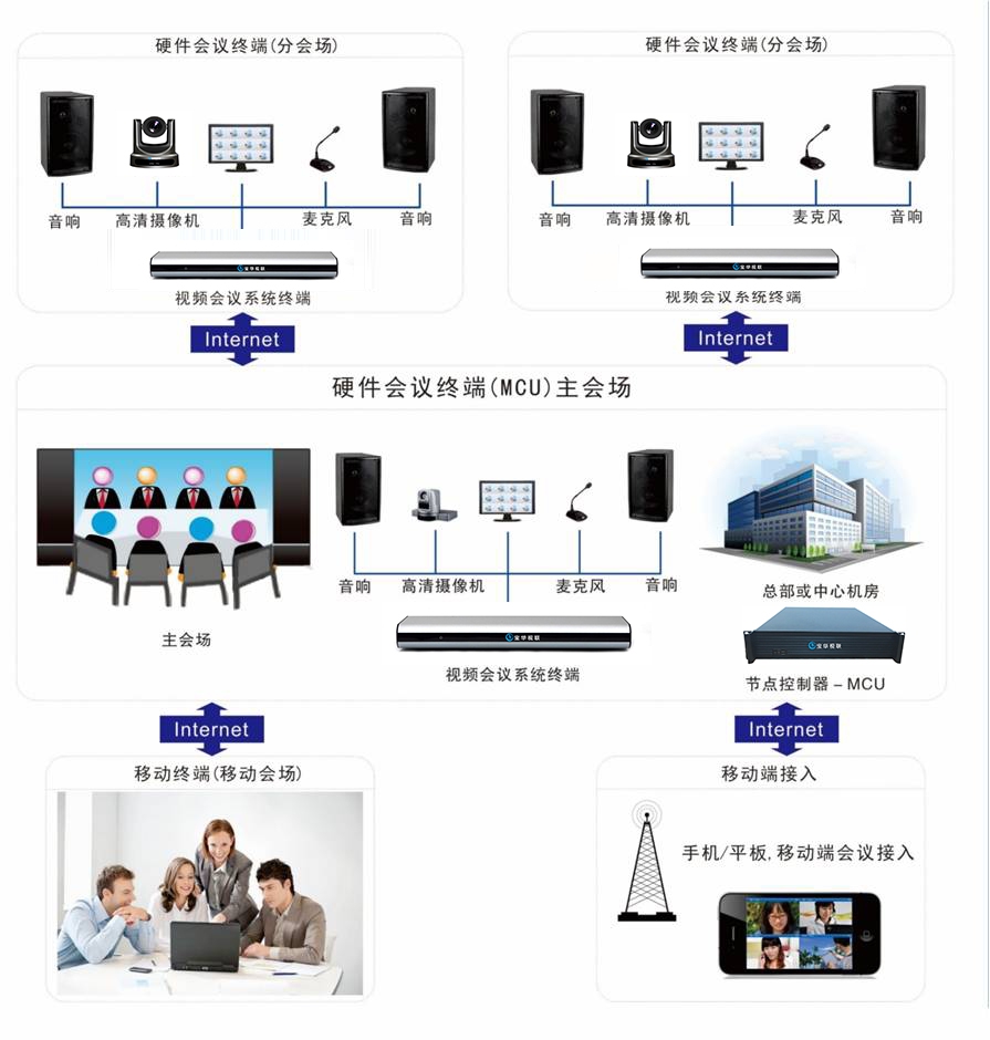 遠程視頻會議系統是指兩個或兩個以上不同地方的個人或群體,通過傳輸線路及多媒體設備,將聲音、影像及文件資料互相傳送,達到即時且互動的溝通,完成會議目的系統。與傳統電話會議相比,具有直觀性強,信息量大等特點。視頻會議系統不僅可以聽到聲音,還可以看到會議參加者,共同面對商討問題,研究圖紙、實物,與真實的會議無異,使每一個與會者確有身臨其境之感
