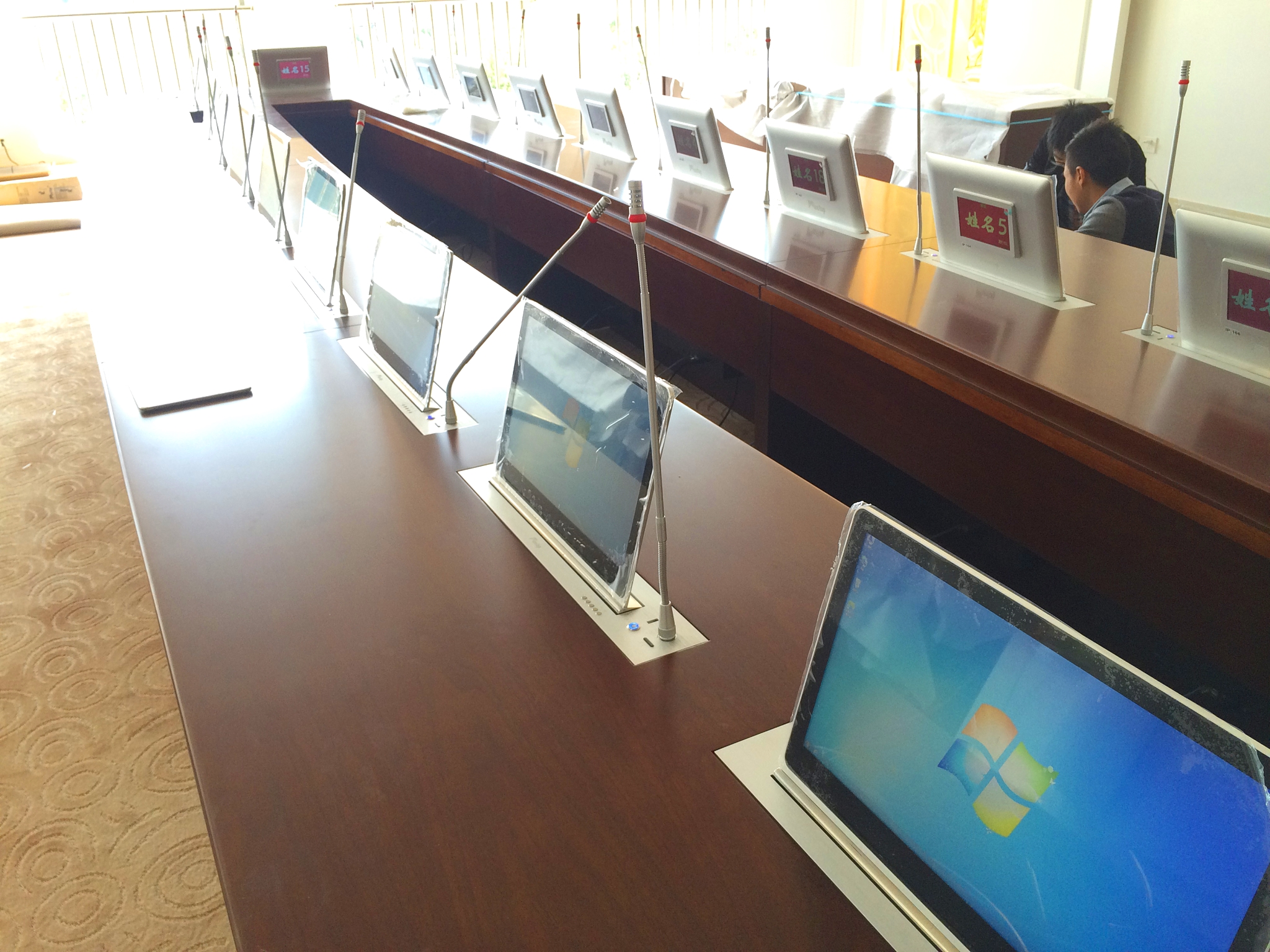 寧波經貿學校會議室,對于事件的應急討論決策急需一個性能穩定、音質清晰、操作簡單的會議系統。對此,京邦電子(KING-BANG)為其提供了高智能會議系M-806A和M-807A系列,DPLL數字鎖相環多信道頻率合成技術,會議聲音清晰通透。音質清晰,通過專業功放和反饋抑制器,音響處理器等眾多設備,配合調音臺,實現對所有會議功能進行集中控制。